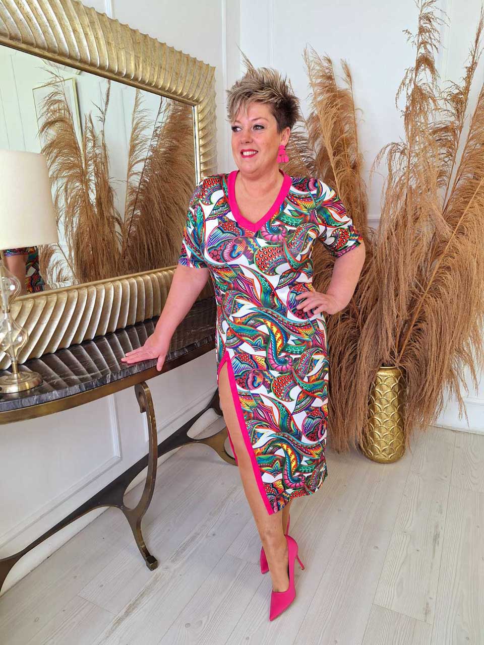Sivulta leikattu värikäs mekko